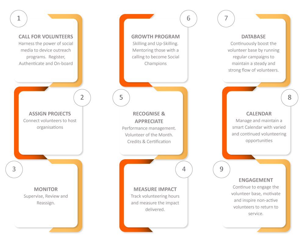To foster a collaborative and efficient atmosphere, we take every effort to manage our volunteers and volunteering programs effectively. All our efforts are directed towards enabling volunteers to focus their efforts, as well as measure and analyse the effectiveness of those efforts.